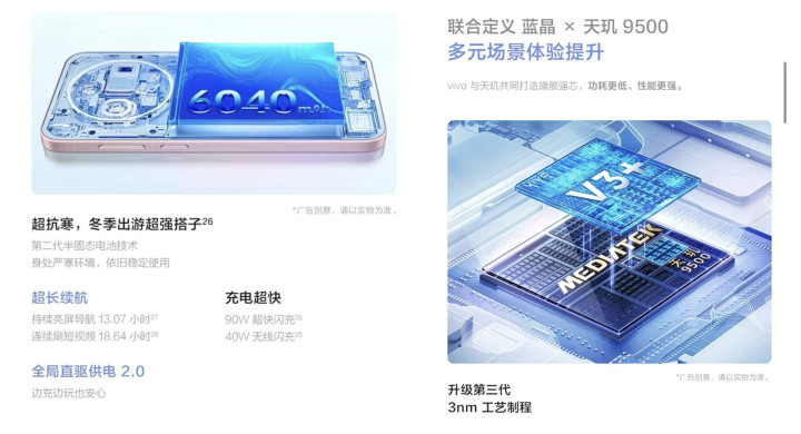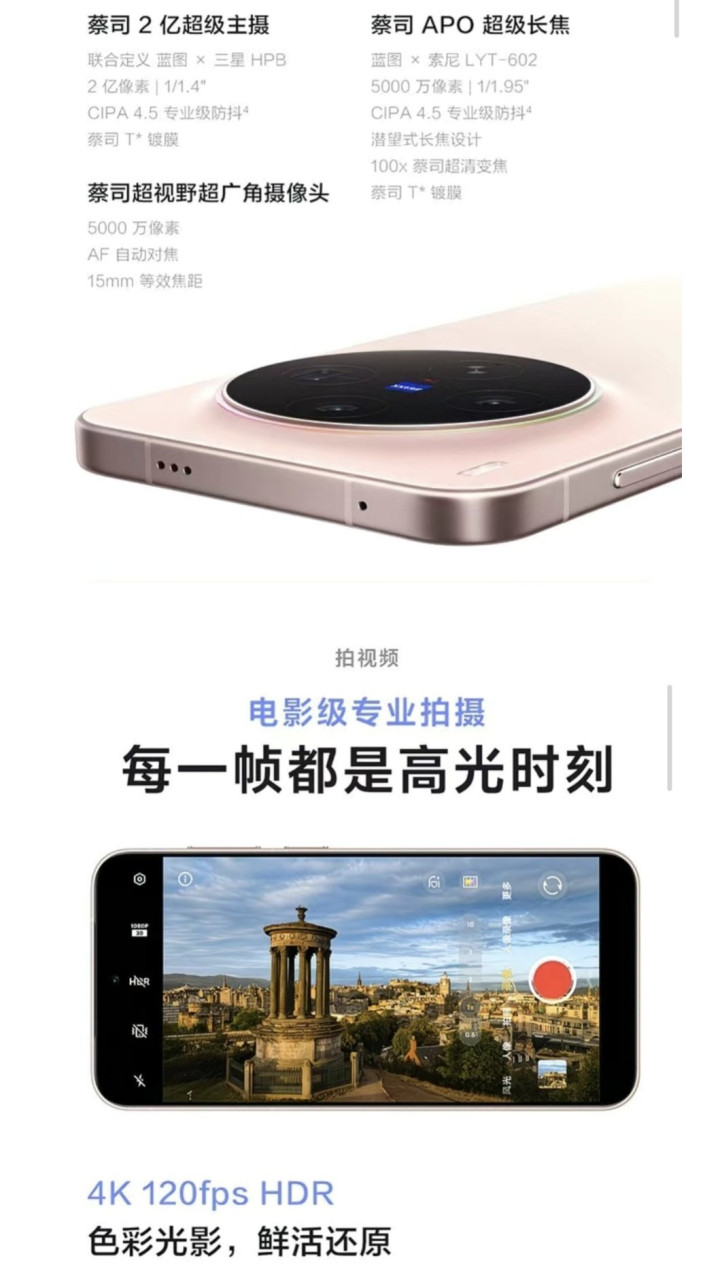 本次vivo依旧首发联发科的天玑9500芯片,配合蓝晶算法,安兔兔跑分接近400万,在性能方面依旧是稳居第一梯队,自研蓝图影像芯片升级到V3+,主摄从818升级为索尼LYT-828,并且支持4K120帧的视频Log,主摄升级为蔡司2亿像素,前摄提升为5000万像素,本次vivo在视频拍摄的能力是有不小提升。